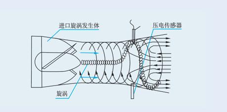 當(dāng)沿著軸向流動的流體進(jìn)入流量傳感器入口時,旋渦發(fā)生體強(qiáng)迫流體進(jìn)行旋轉(zhuǎn)運(yùn)動,于是在旋渦發(fā)生體中心產(chǎn)生旋渦流,旋渦流在文丘利管中旋進(jìn),到達(dá)收縮段突然節(jié)流使旋渦流加速,當(dāng)旋渦流進(jìn)入擴(kuò)散段,因回流作用強(qiáng)迫進(jìn)行旋進(jìn)式二次旋轉(zhuǎn)。此時旋渦流的旋轉(zhuǎn)頻率與介質(zhì)流速成正比,并為線性。兩個壓電傳感器檢測的微弱電荷信號經(jīng)前置放大器差動放大、濾波、整形后變成兩路頻率與流速成正比的脈沖信號,同時處理電路對兩路的脈沖信號進(jìn)行相位比較和判別,剔除干擾信號,而對正常的流量信號進(jìn)行計數(shù)處理。