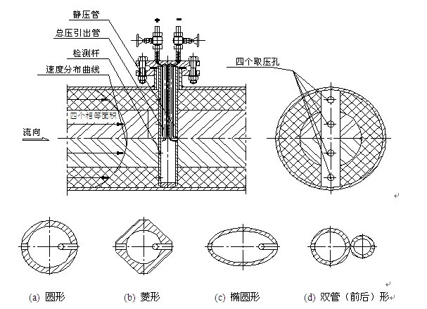 1、均速管流量計由檢測桿、取壓口和導(dǎo)桿組成。均速管的檢測管截面形狀分為圓形、菱形、橢圓形等多種結(jié)構(gòu)。如圖所示。